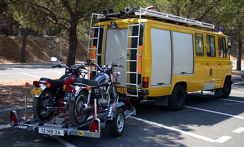 dienst als trekpaard met daarachter onze motortrailer met daarop twee motoren,